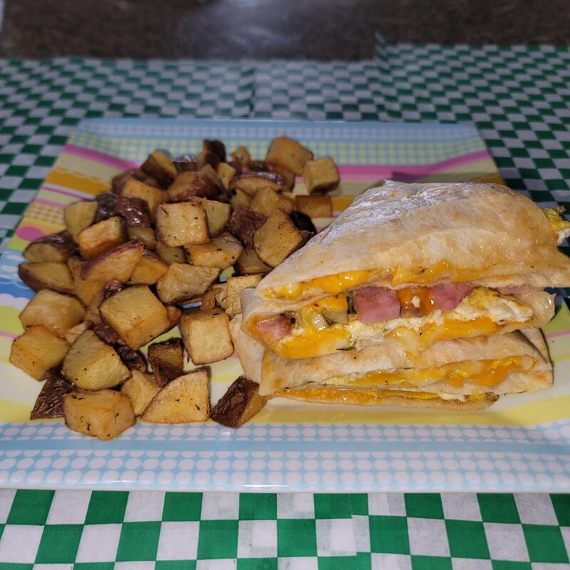 Your choice of Bacon, Ham or Sausage, an egg any style (Fried, Scrambled or Over Easy) with Cheddar Cheese. Comes with a side of country potatoes.